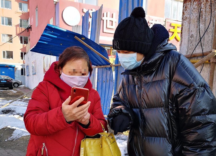 “姑娘,你帮我看看我这手机怎么办健康码啊,我不会用啊”,一位大娘来到正在值岗的薛梦迪旁边,询问如何申领健康码。