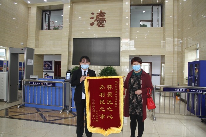 她对孙琪及立案庭的工作人员说:“真的非常感谢你们,我妹妹离得远,还着急办理结婚,是你们帮她解了燃眉之急,所以她特意制作了一面锦旗,寄过来让我送给你们,希望你们能收下。”