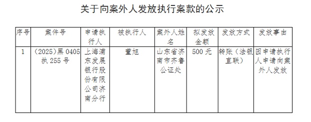 为切实巩固执行案款清理成果,强化执行款管理,依法维护当事人合法权益,防范廉政风险,确保执行案款发放规范有序、及时高效。依据《黑龙江省高级人民法院向案外人发放执行案款公示制度》的规定,现对以下向案外人发放执行案款信息予以公示,公示期间2025年9月3起至2025年9月9日止。